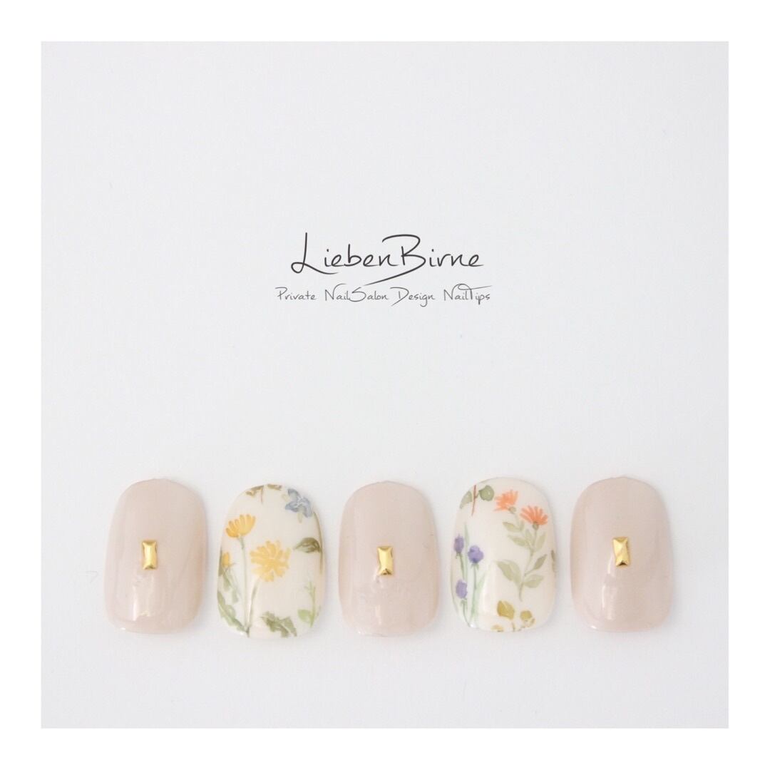 押し花のような繊細なお花をたくさん散りばめ、ナチュラルながらも華やかな印象に。カラフルさを残しつつ、ダスティカラーでまとめて大人っぽい雰囲気に。