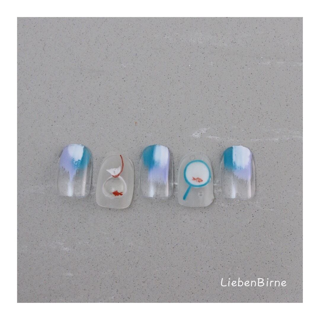 縁日といえば、金魚すくい!浴衣の袖を濡らしながら必死にすくった金魚。金魚をすくうポイと、お水たっぷり袋を描いたユニークネイルになりました♪